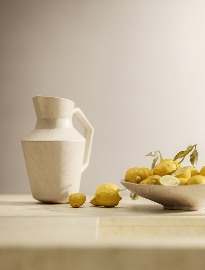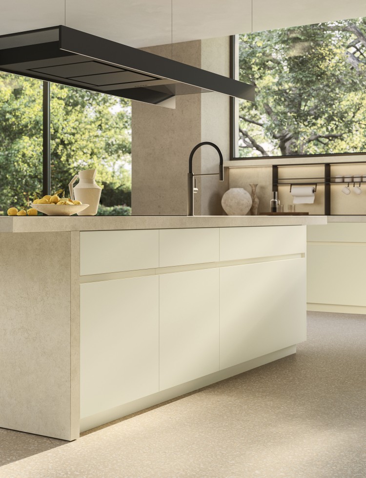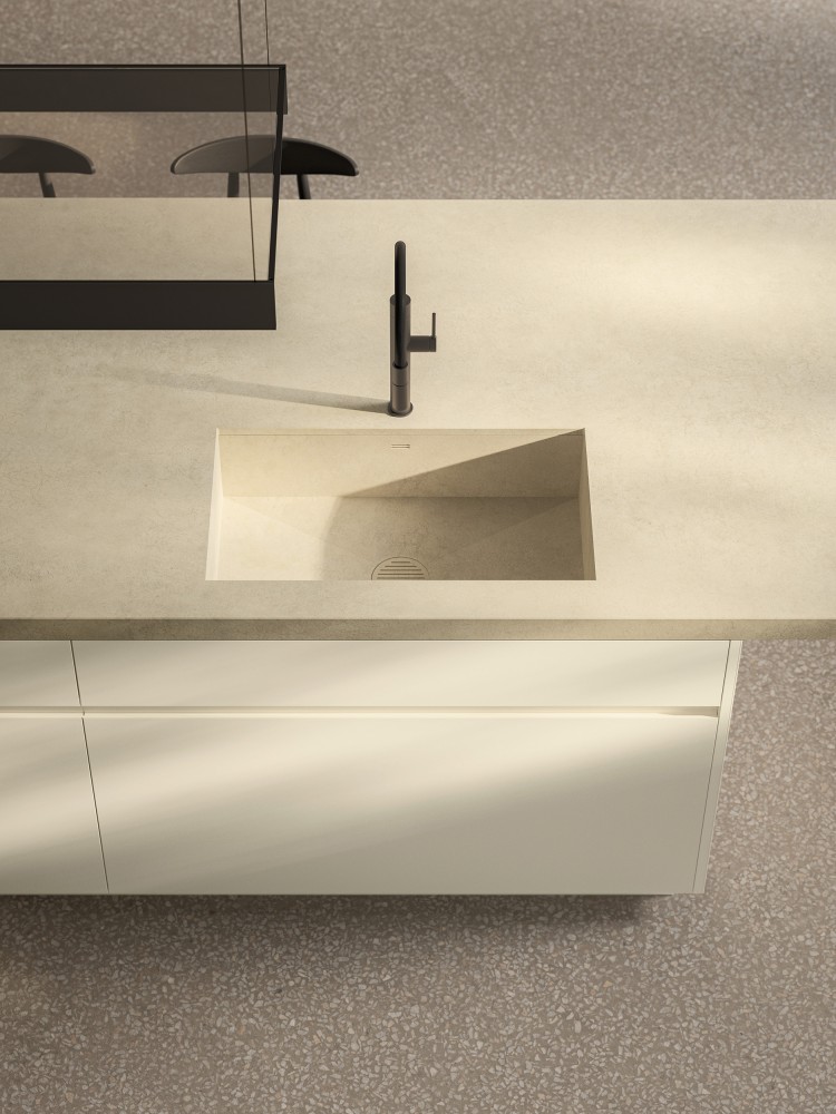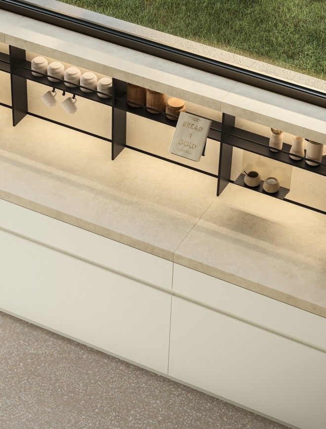 Éléments bas avec façades Antis Pro Up en laqué mat texturé Bianco et avec poignées Pro Up en laqué mat Bianco, socle H.8 cm laqué mat Bianco ; crédence et plan de travail ép.60 mm en Gres Laminam Terra di Matera.
