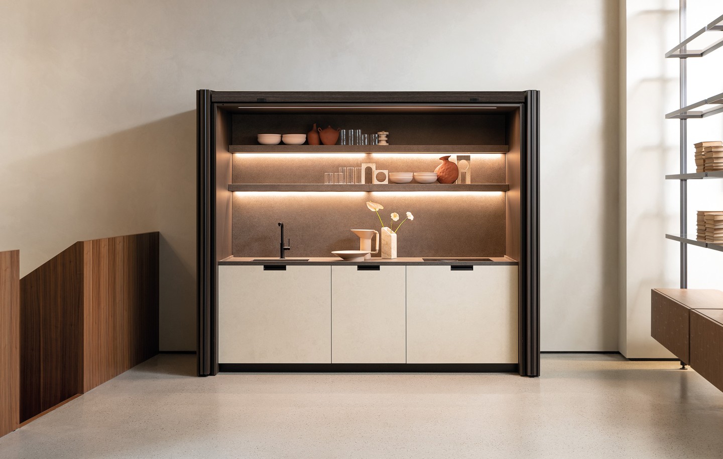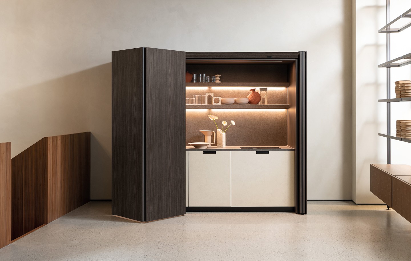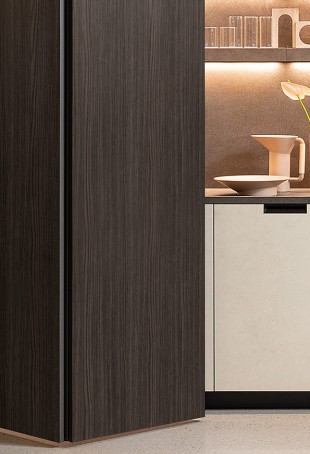 CABINET FOLDING Système de rangement à portes coulissantes escamotables avec ouverture push-pull en TSS Rovere Combusto