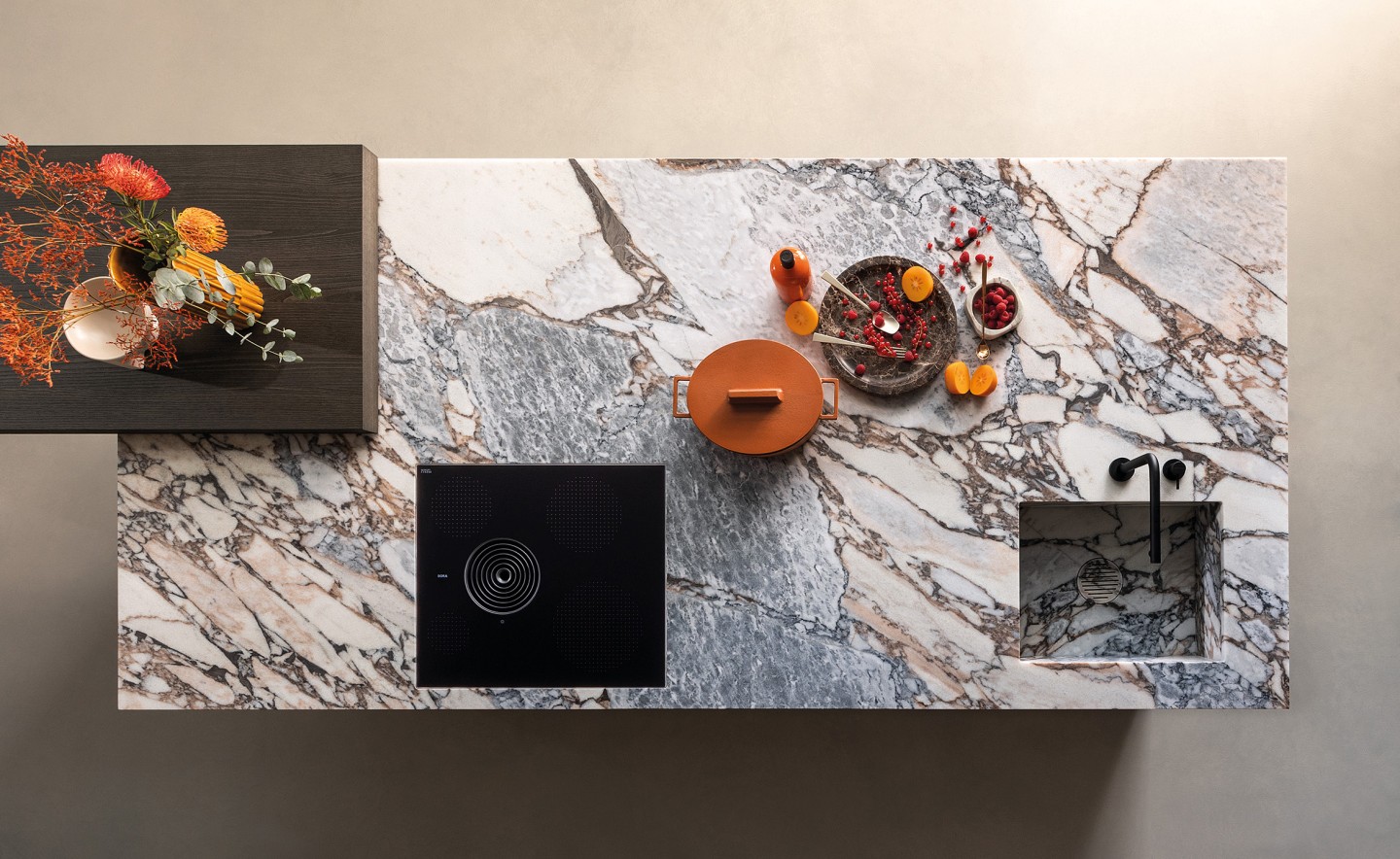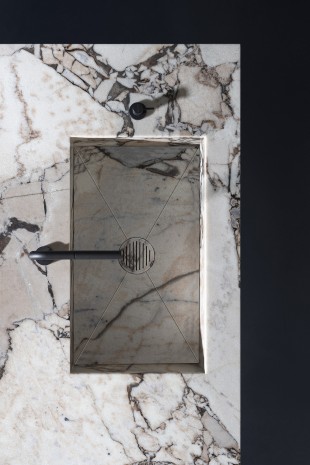 Plan de travail pierre naturelle marmo Ocean Storm avec cuve d’évier intégrée.