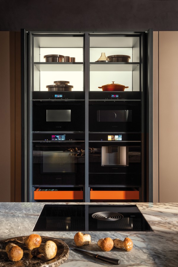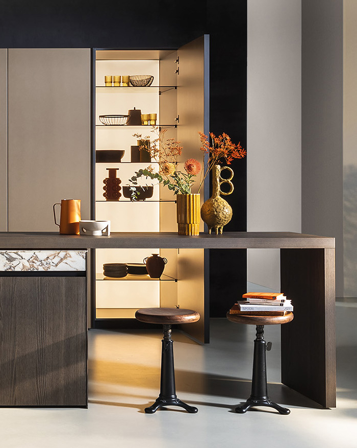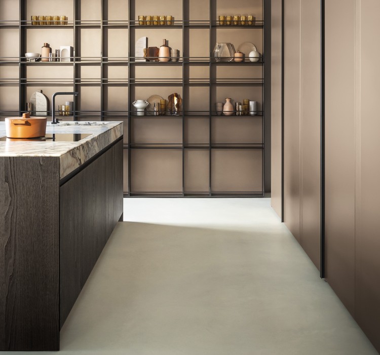 Colonnes ouvertes en aluminium anodisé Nero et panneau de fond laqué anodisé Bronze.