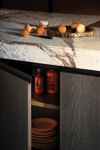Éléments bas avec façades en plaqué châtaignier sablé Dark et en pierre naturelle marmo Ocean Storm.